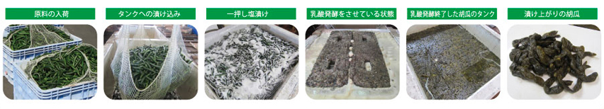 乳酸発酵をさせて漬け込むことにより、生きゅうりの皮の部分のイヤ味が無くなり、アミノ酸が増え旨味が多くなり、きゅうり製品がより一層おいしくなることを代々受け継いできました。